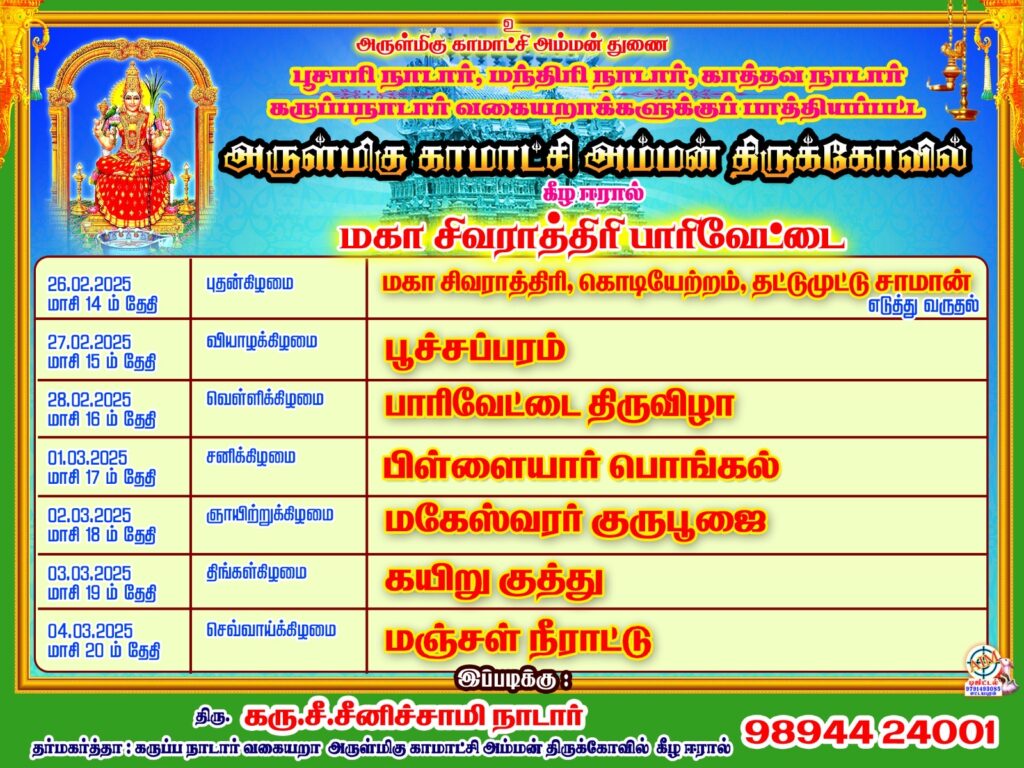கீழஈரால் ஸ்ரீ காமாட்சி அம்மன் மகாசிவராத்திரி விழா நிகழ்ச்சி நிரல்